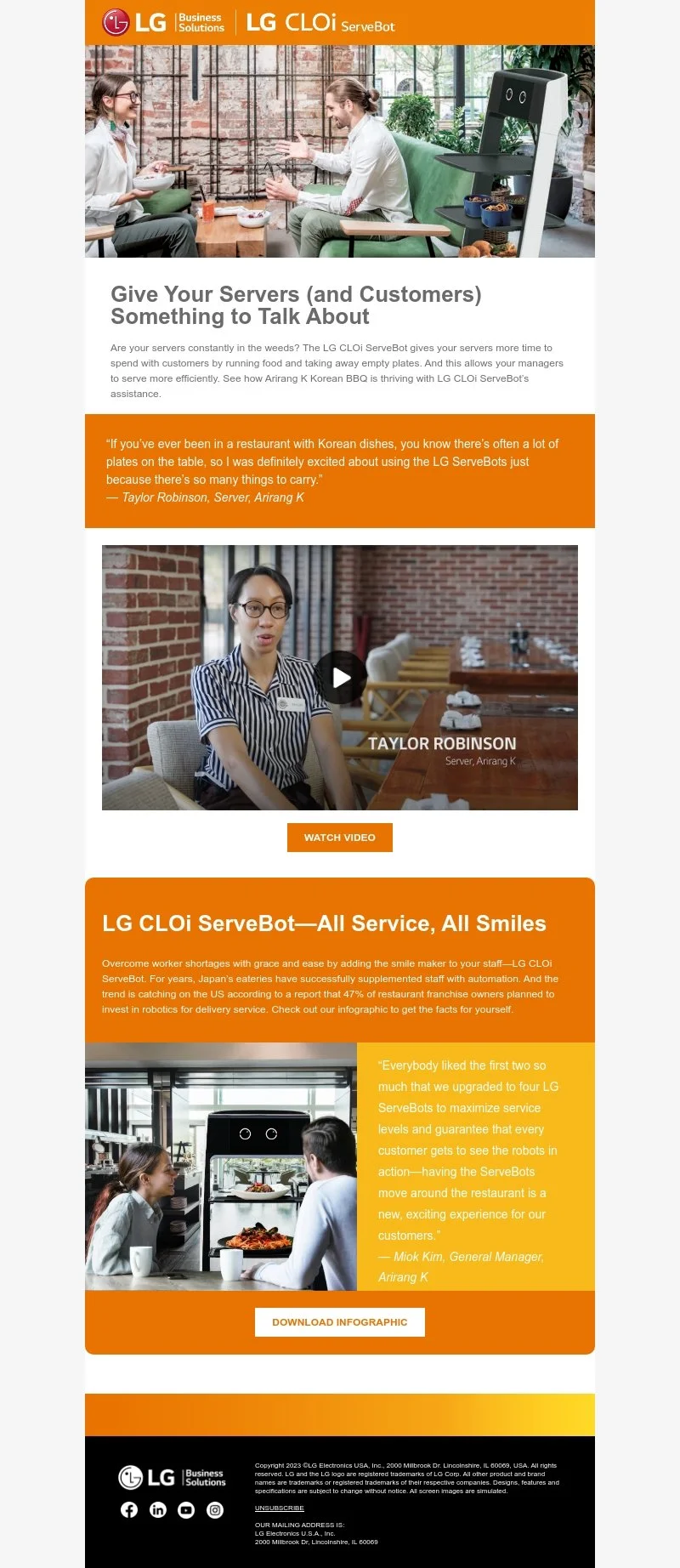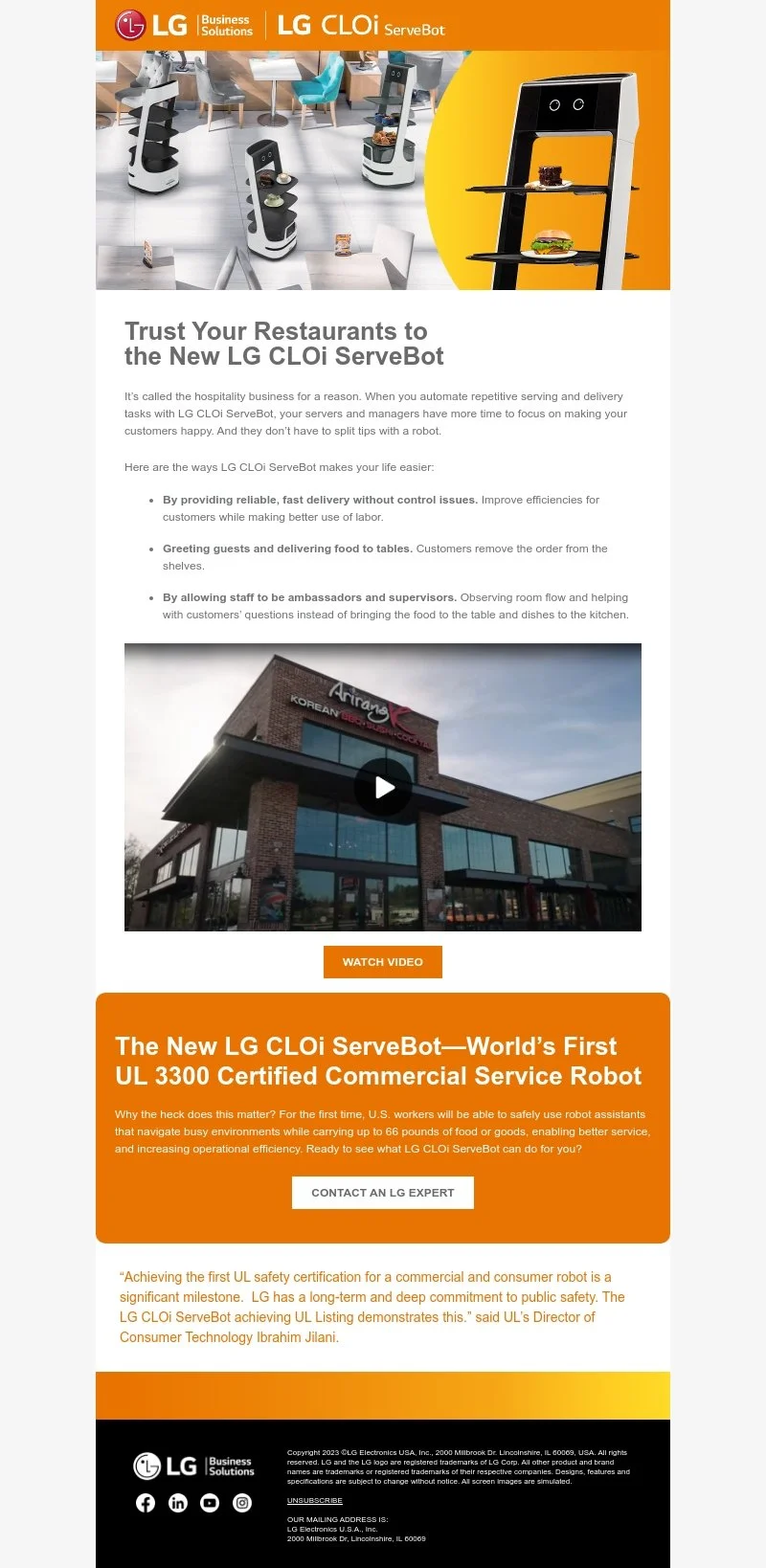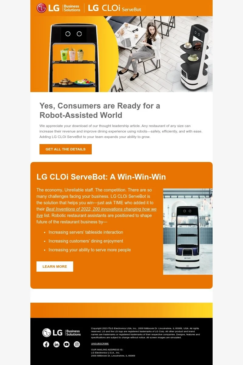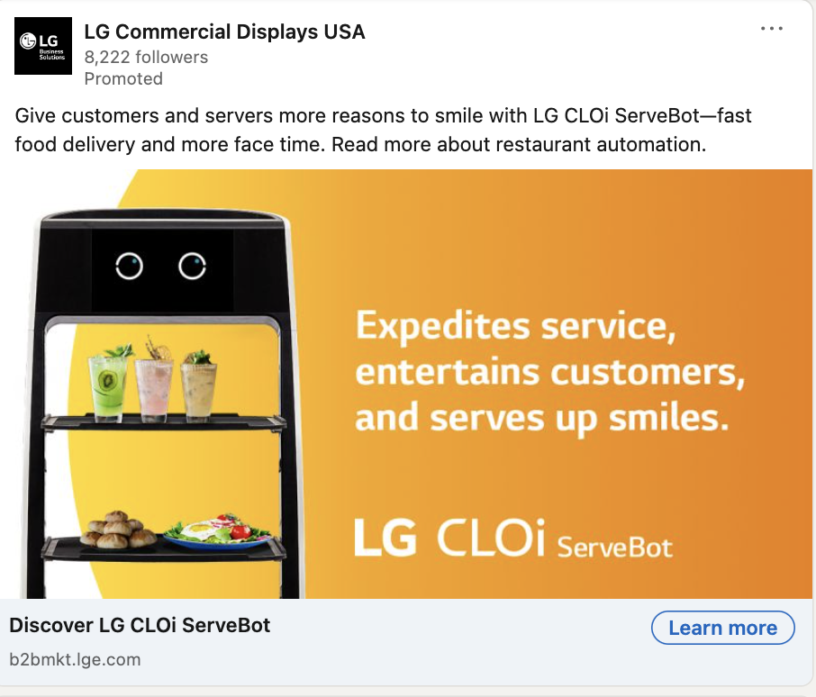 Our job? To create a halo of demand and generate leads for the CLOi ServeBot around LG's appearance in the 2023 National Restaurant Association Show. Utilizing insights, we needed to inform fast casual decision makers about the fun and efficiencies robotic servers bring.
